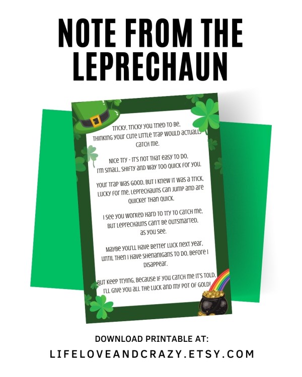 Every year we make a trap to catch that sneaky little leprechaun. We improve it each year to make it more enticing. More green, more gold coins, more foolproof traps. But every year he gets away and causes green havoc on our house. Last year, he even left this note behind. Purchase this fun note... Continue Reading →
