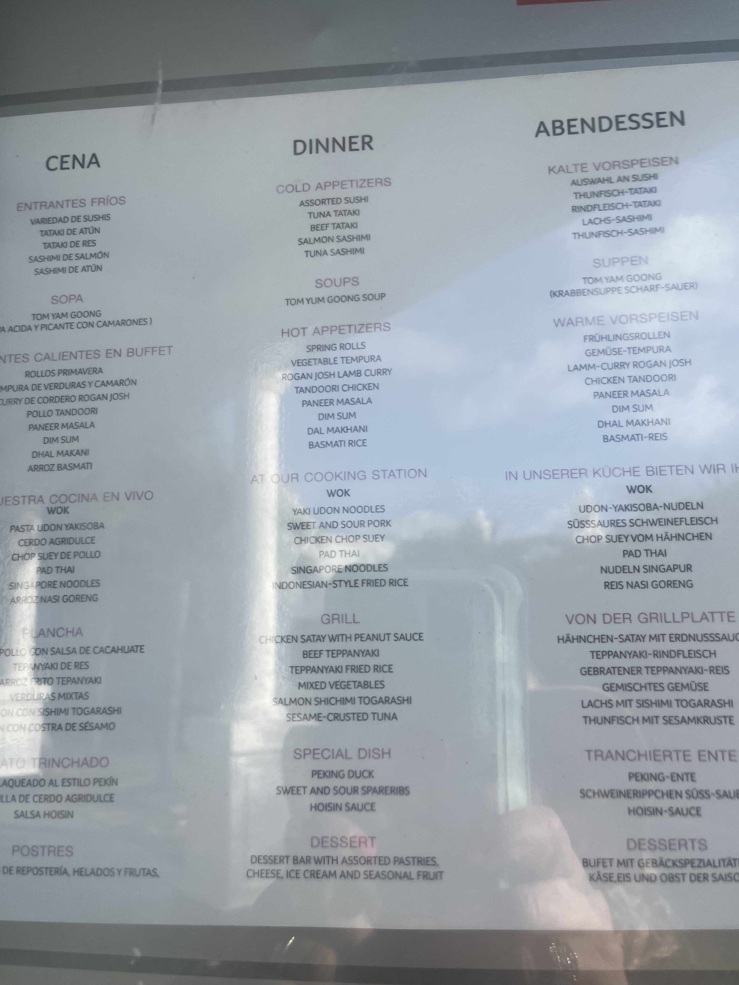 Night 3 we tried the Japanese restaurant. The menu showcased a wok with noodles, chicken and pork, a grill with beef, tuna and fried rice, a few appetizers and special dishes. Our family loves Japanese food, so we were excited to try it out. Unfortunately, we were less than impressed. The food was all served buffet-style, and it was more like lukewarm Chinese food than the Japanese we had hoped for.