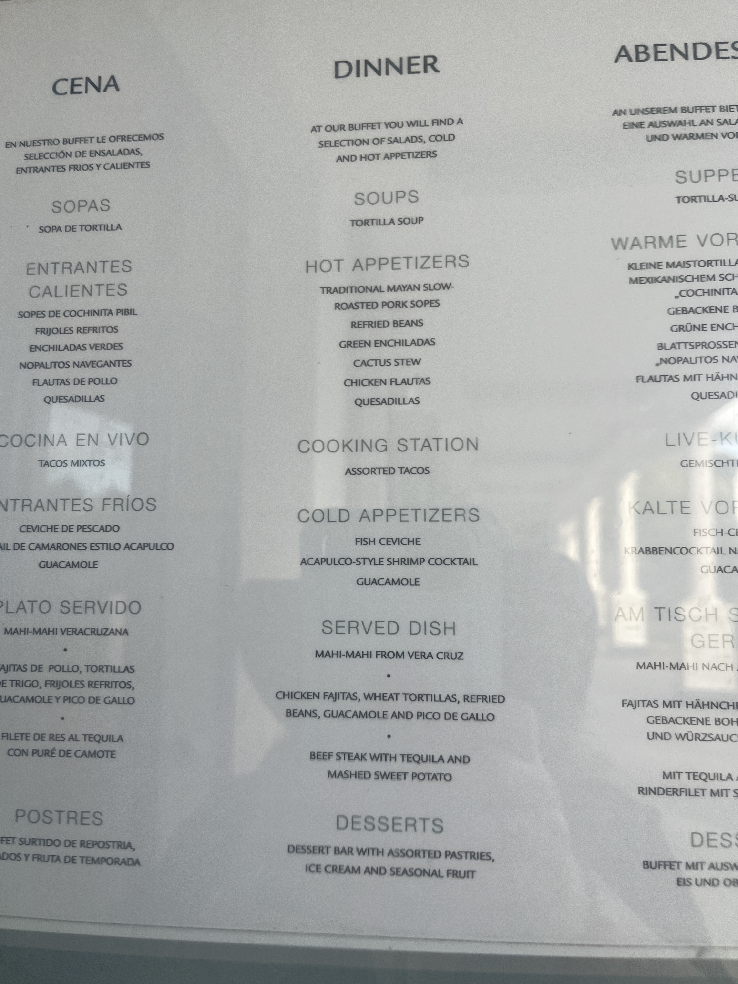 The dinner restaurants seemed to vary the most. There were a few nice, sit-down a-la-carte restaurants, a few buffets, and some options that had both. Our first night, we tried the Mexican restaurant. They had a buffet for appetizers and desserts and 3 choices for a hot, plated main dish. Our crew made their own nachos/tacos and ordered the chicken fajitas for their main meal. We enjoyed our meal and had good service at the Mexican restaurant.